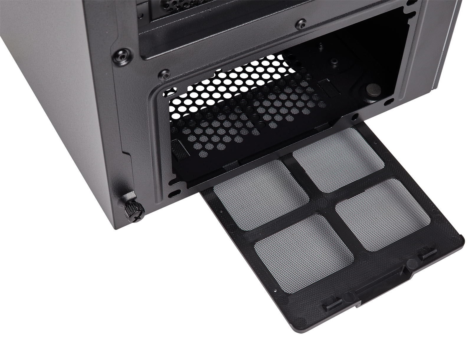 Another nice feature, and one that’s also growing very quickly in popularity, is the full-length PSU shroud. Let’s face it: there’s often a rat’s nest at the bottom of our chassis, and really, it’s super-hard to avoid. A shroud helps hide the mess, and also helps you look like a pro builder. To battle dust, the chassis features a removable filter at the top, front, and bottom.
